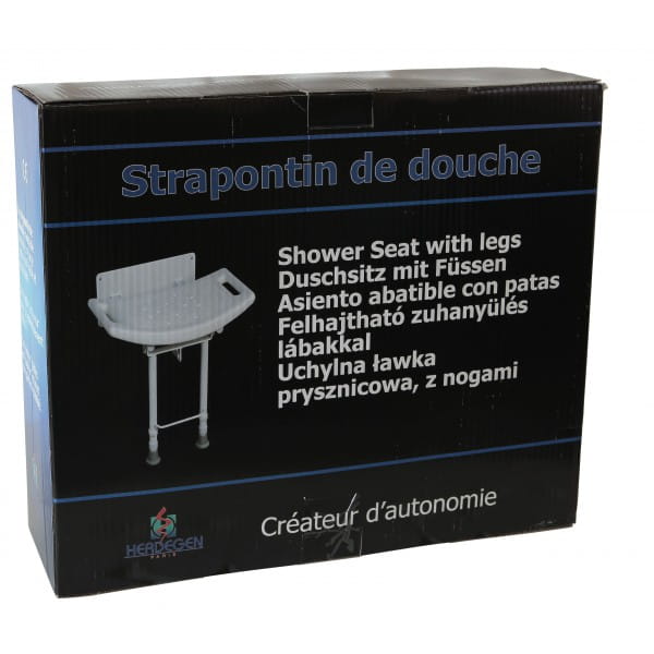 Siedzisko naścienne składane pod prysznic wyposażone jest w nogi. Na metalowej ramie umocowane jest plastikowe siedzisko.